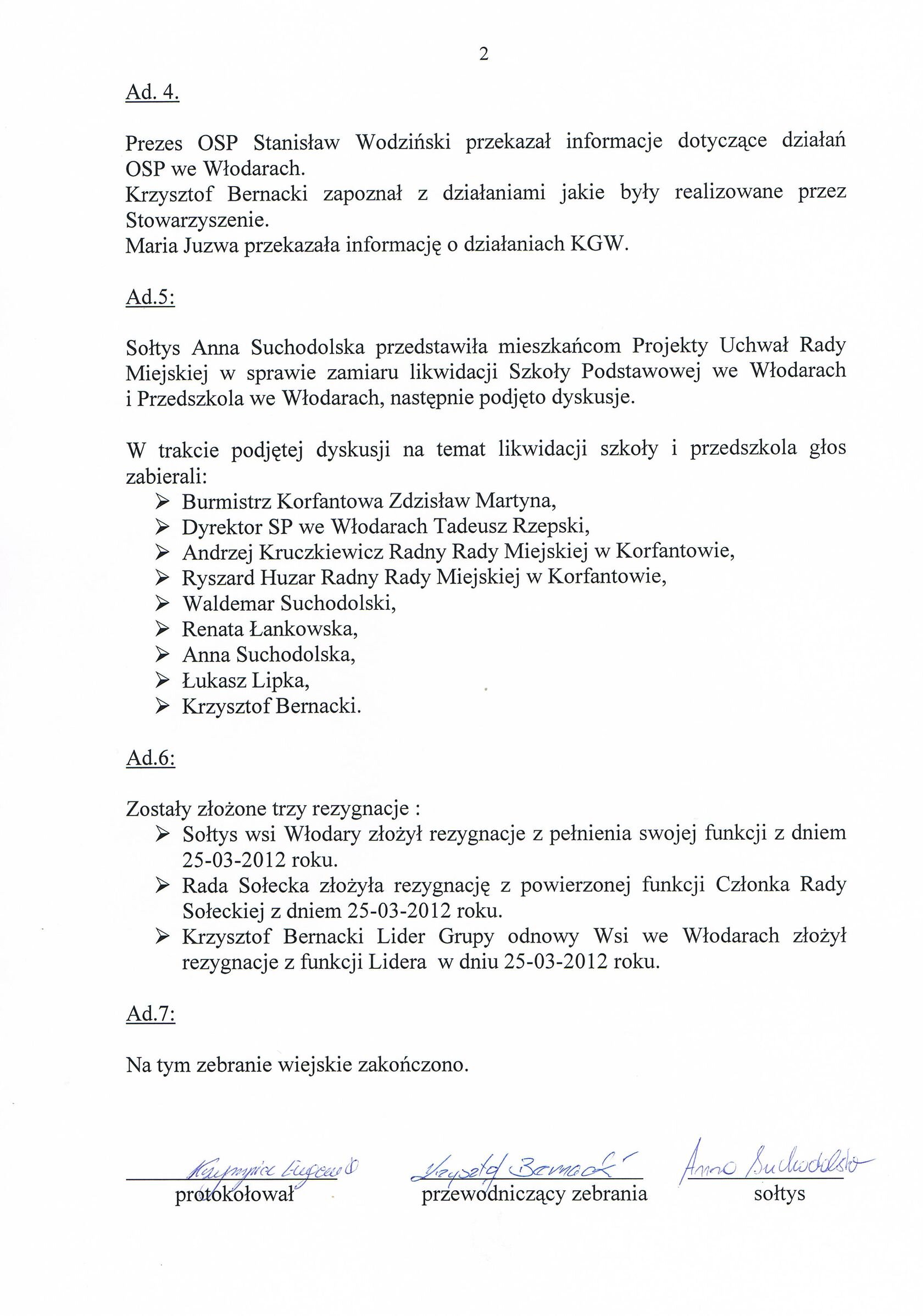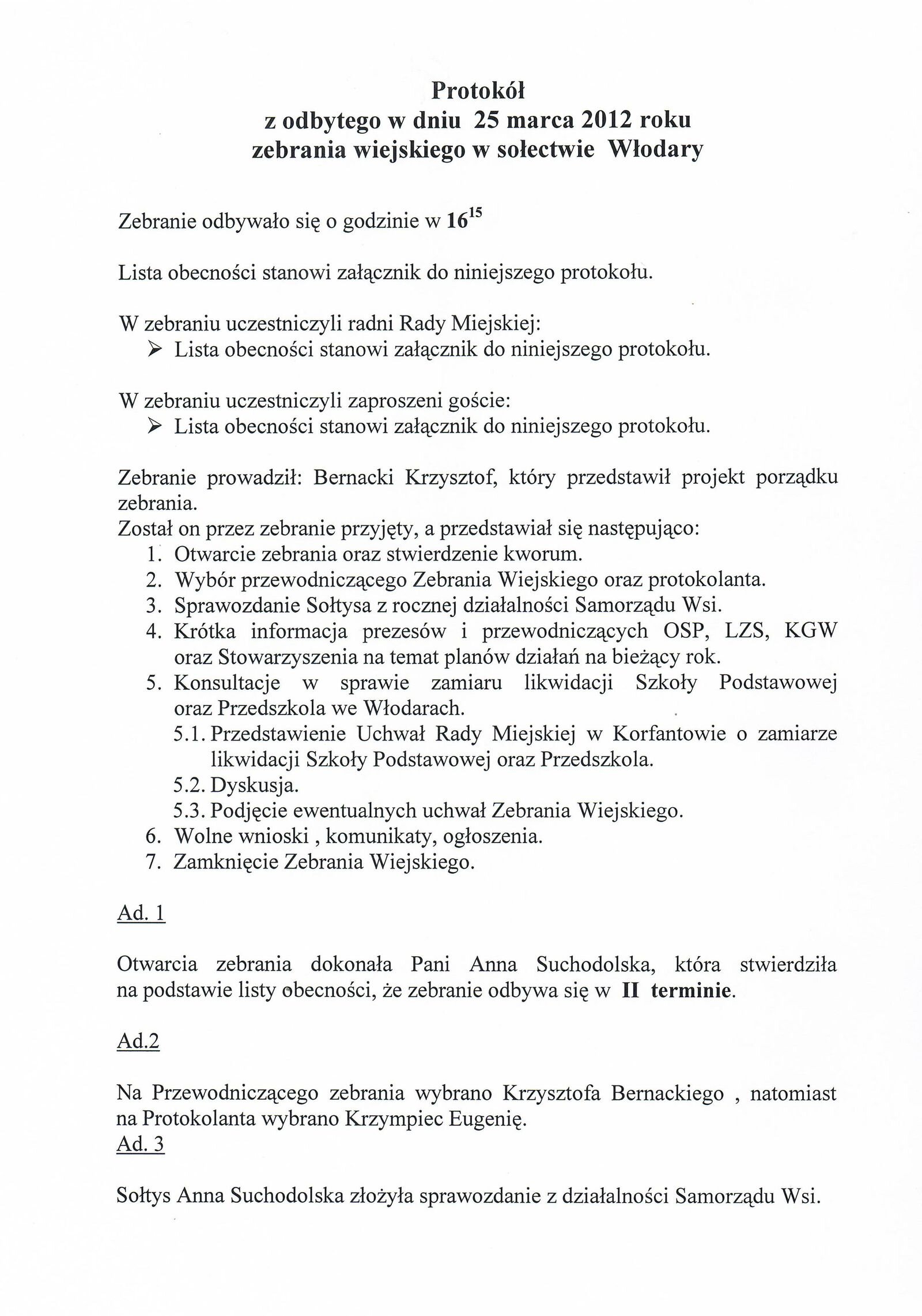 W zebraniu uczestniczyło 44 mieszkańców Włodar. Z powodu braku kworum zebranie odbyło się w drugim terminie o godz. 16;15