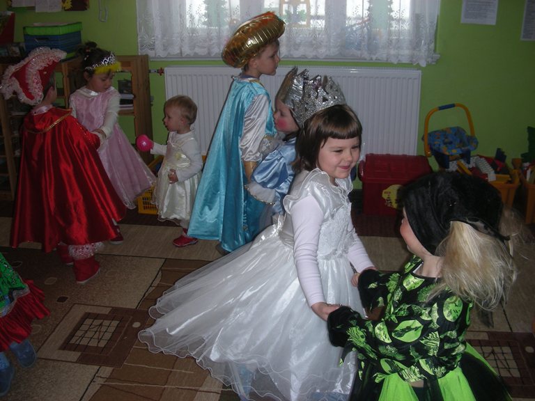 Przy akompaniamencie różnych rytmów i melodii dzieciaki zabawiały się na Balu Karnawałowym, który w tym roku odbył się przed samymi feriami ,tzn. 15.01.09r. Rodzice bardzo mile nas zaskoczyli, przebierając swoje pociechy w rozmaite stroje- wymyślone, wypożyczone, a dzieci zaskoczyły nas swoją odwagą i chęcią pokazania się wszystkim w przedszkolu w nowym, zagadkowym przebraniu. Wszyscy czekaliśmy z wielkim zaciekawieniem, kto następny wejdzie na salę. Na początku zjawił się żołnierz z małą księżniczką, później Batman, muszkieter, Alladyn. Przyszły również trzy inne księżniczki-a wśród nich królowa trzymająca w dłoni berło. Był też Czerwony Kapturek, ale dobrze, że nie było wilka. Przyszła zielona żabka ze swoją siostrą przebraną za.........? ha-ha-ha czarownicę, której jednak nikt się nie bał.