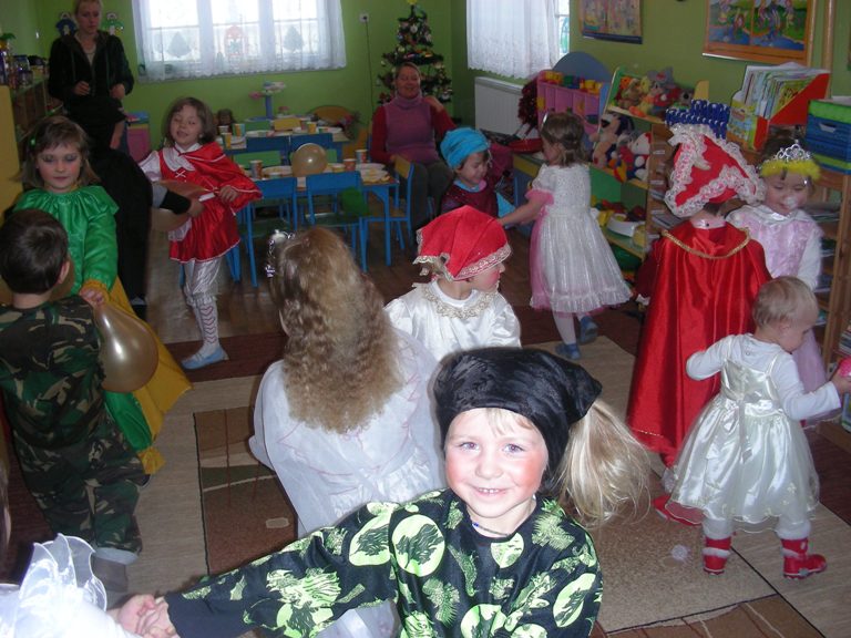 „Bal w przedszkolu dzisiaj wyszły z szafy misie i proszą laleczki do miłej poleczki. Mała złota trąbka wyskoczyła z kątka tru-tu-tu powiada zatańczę wam rada.