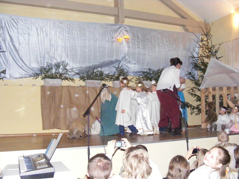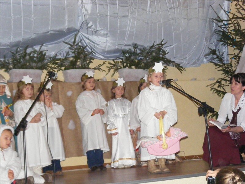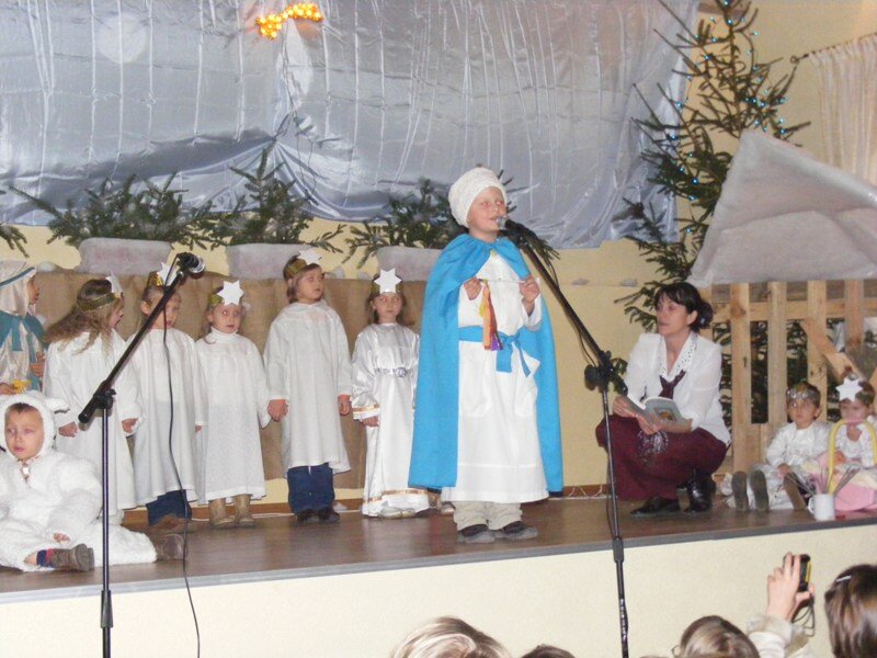 Mali aktorzy wystąpili jako pierwsi na scenie. Pojawiły się na niej baranki, aniołki, pasterze, którzy w rytm muzyki szli do stajenki.