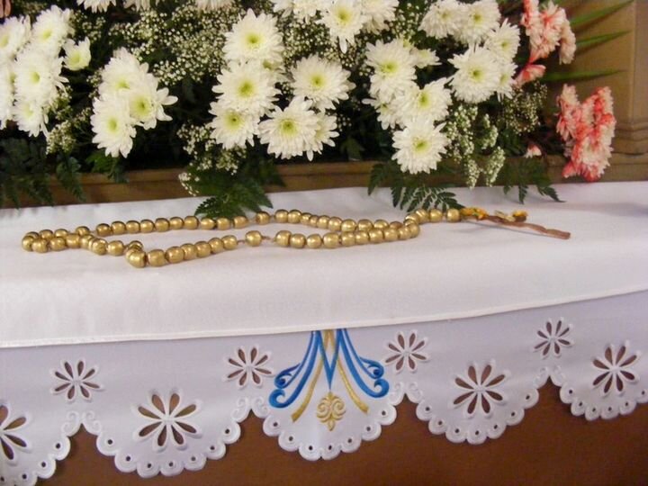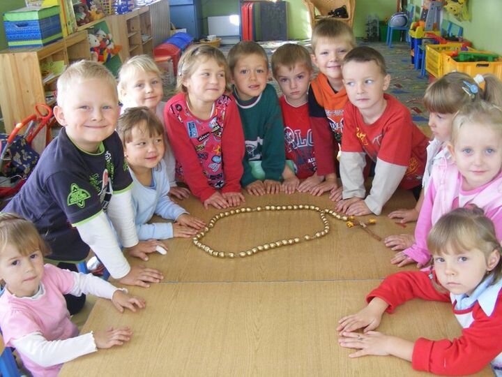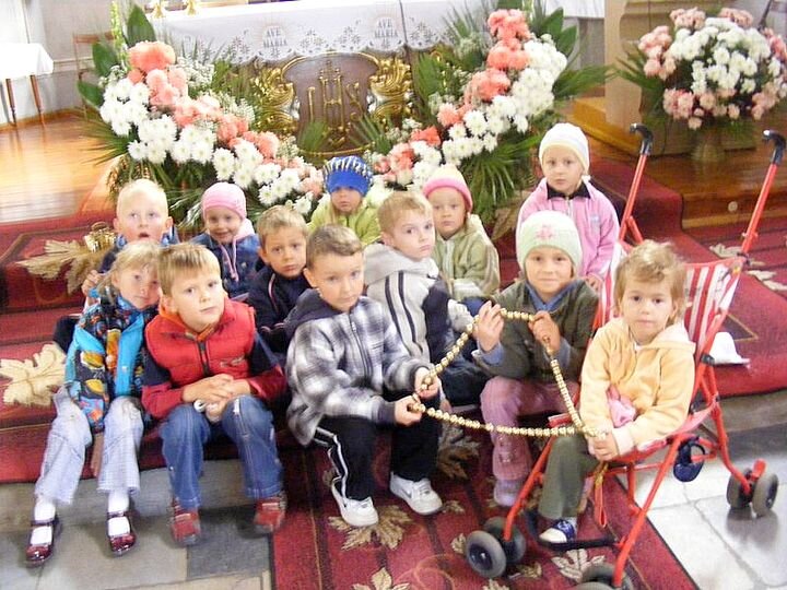 Dzieci wraz ze swoimi Paniami wykonały różaniec z żołędzi, ale pozłacanych, ponieważ pomalowały je farbą. Prezentuje się bardzo ładnie. Można zobaczyć go na własne oczy. Dzieci z Paniami zaniosły go do Kościoła, gdzie zdobi ołtarz Maryjny.