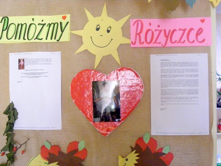 W tym roku szkolnym zechciała przyjść do nas, czyli do przedszkola mała Różyczka. Wszyscy bardzo dobrze ją znamy, gdyż jest dzieckiem bardzo wesołym, sympatycznym i medialnym, ale.... No właśnie to jedno, ale przekreśla dziewczynce możliwości prawidłowego funkcjonowania w grupie rówieśniczej. Różyczka bardzo dzielnie sobie radzi ze swoją niepełnosprawnością, a dzieci wręcz przepadają za nią. Podczas spaceru wszyscy chcą iść z Różyczką, trzymając się ręki dziewczynki, która jedzie na wózku. Bardzo chętnie jej pomagają. Uczą się w ten sposób pomagać słabszym. A oto kilka zdjęć z pobytu w przedszkolu. Ogłosiliśmy również akcję charytatywną w przedszkolu pod nazwą:,,Pomóżmy Różyczce”